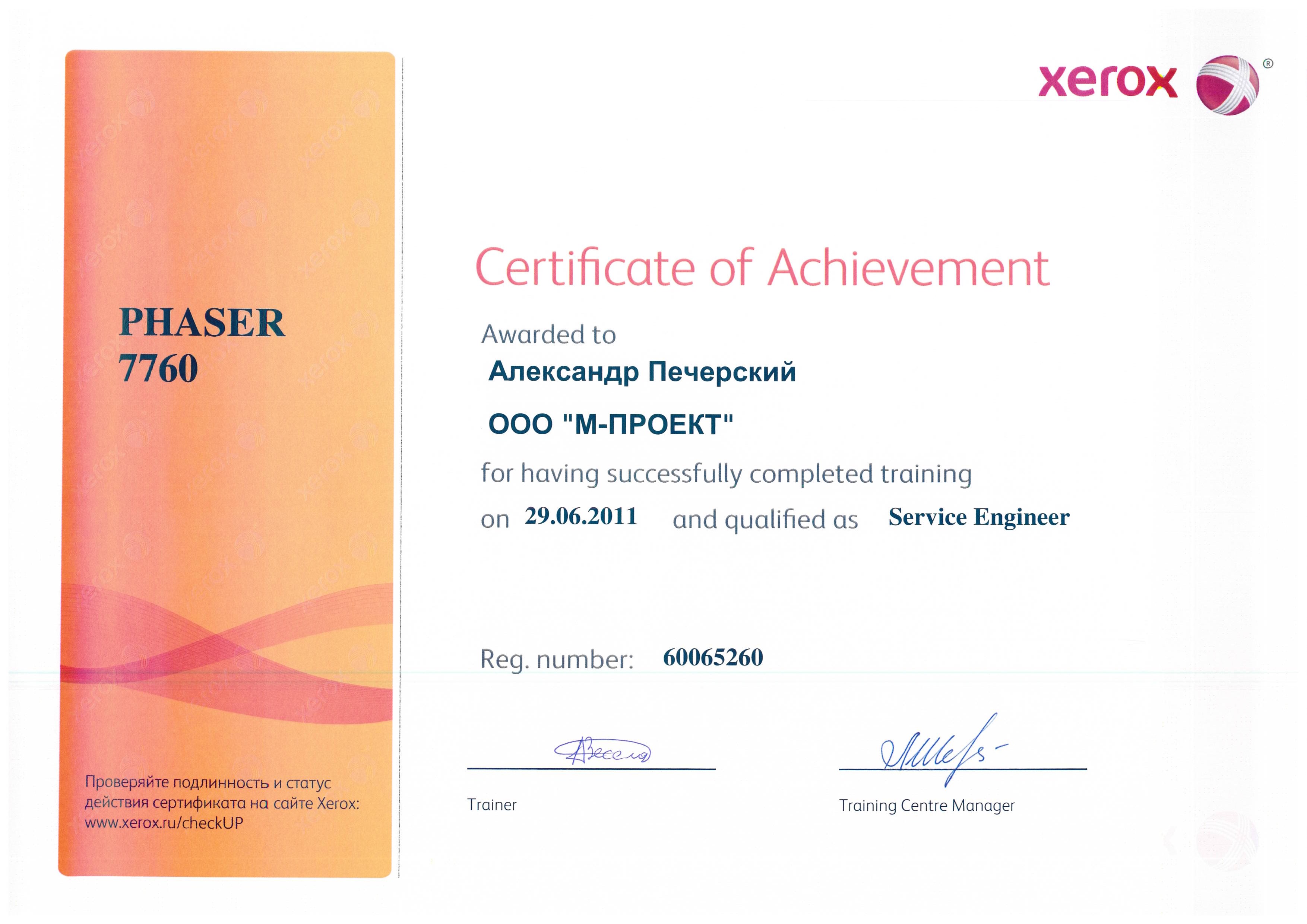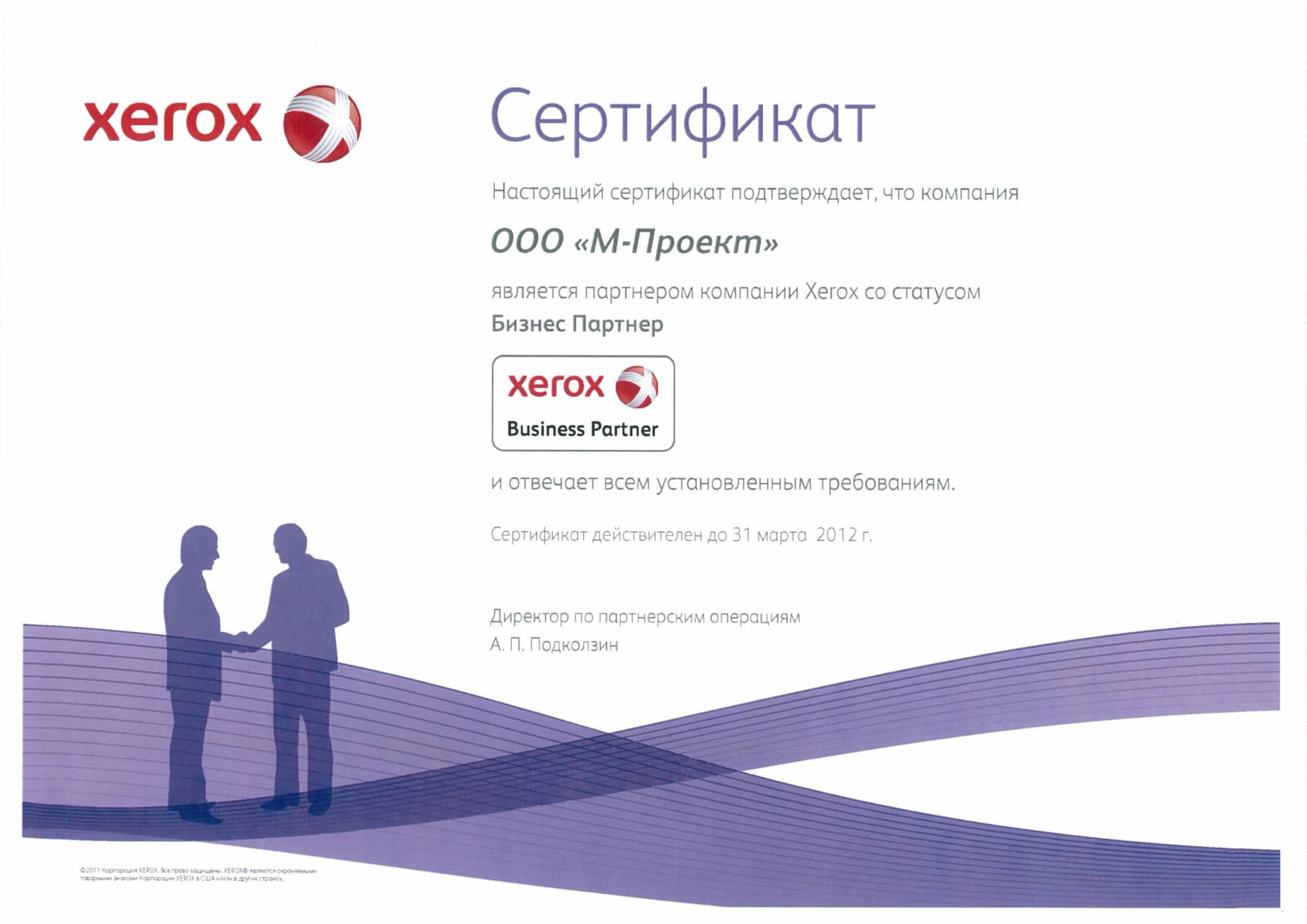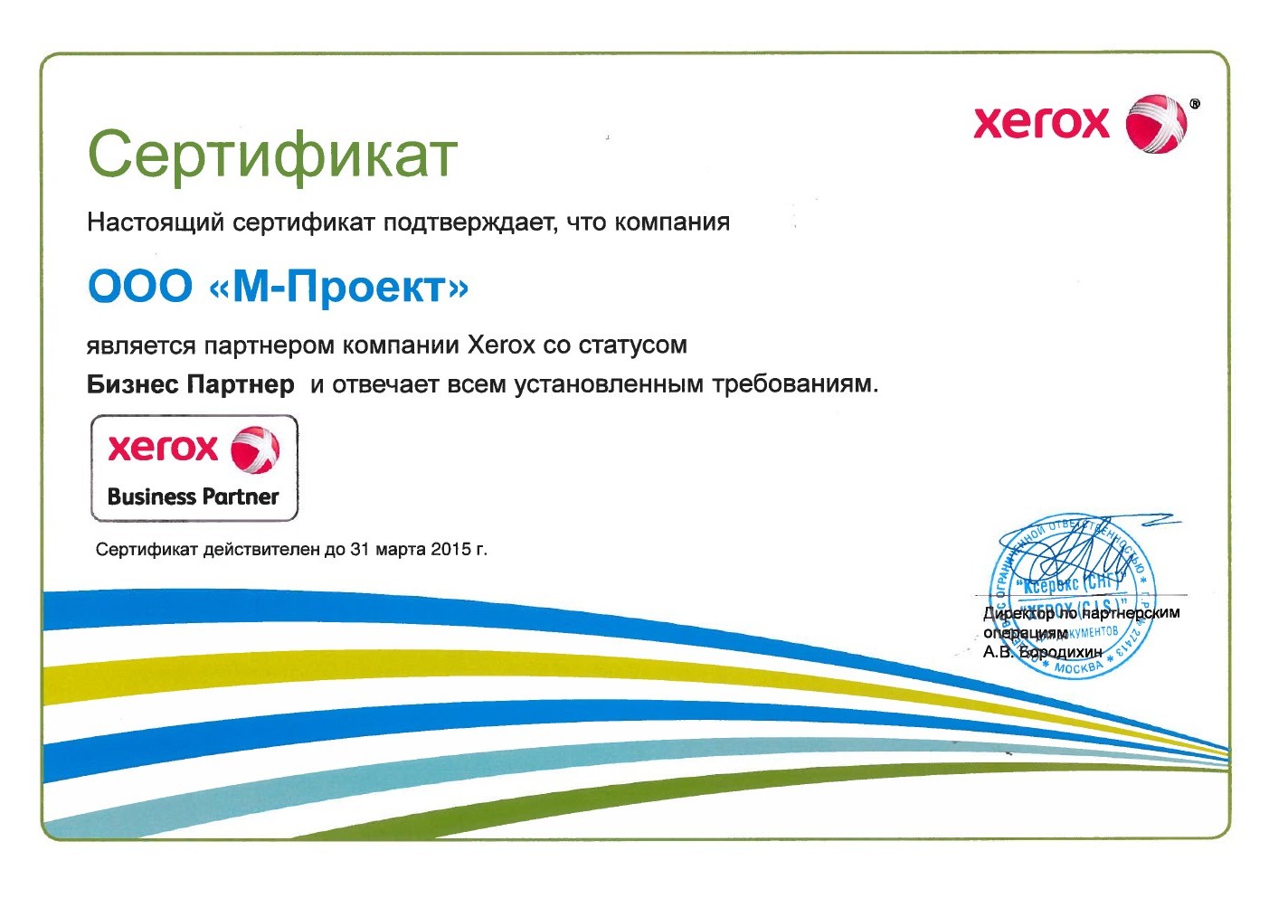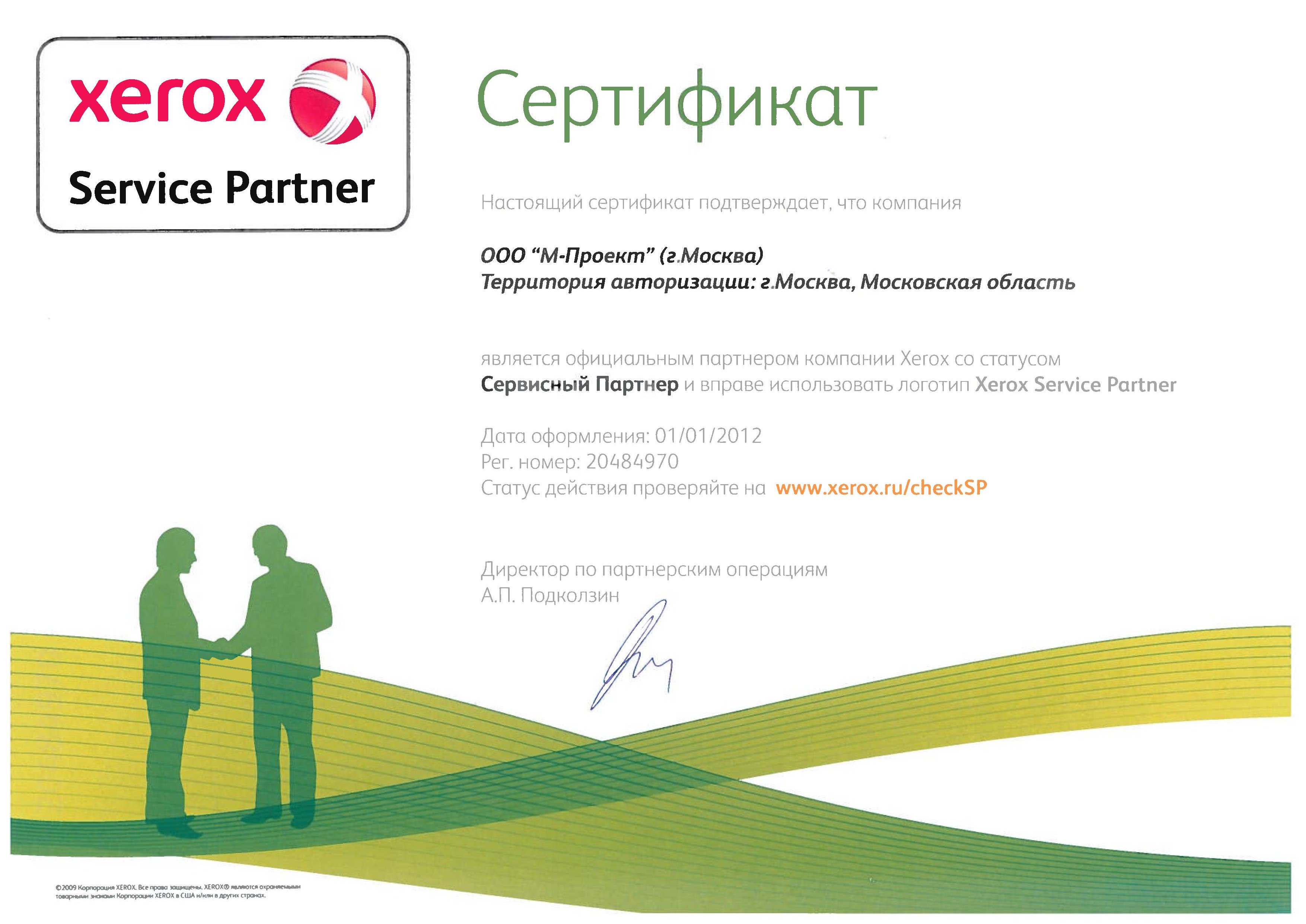 Данные сертификаты подтверждают, что компания «М-Проект» является Авторизованным сервисным и бизнес-партнером компании Xerox