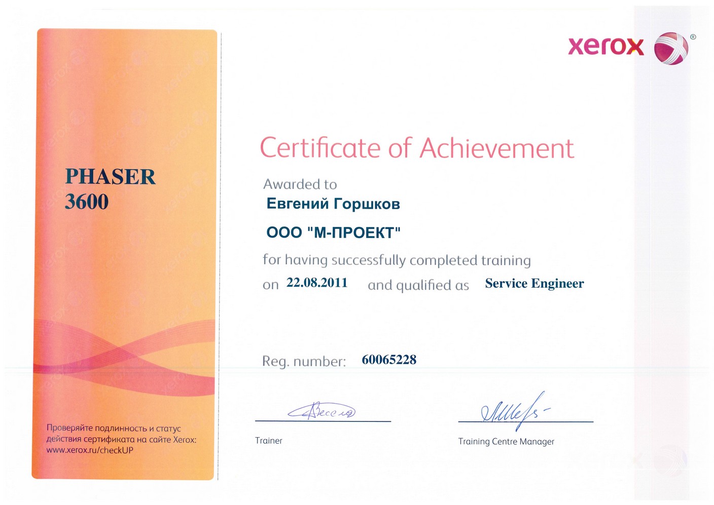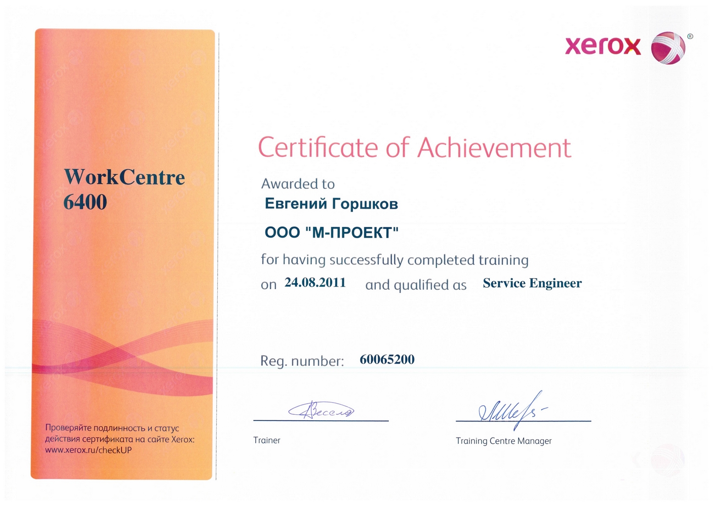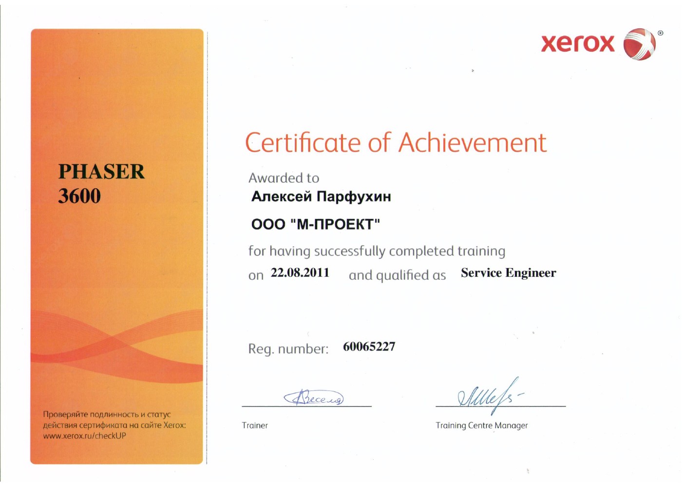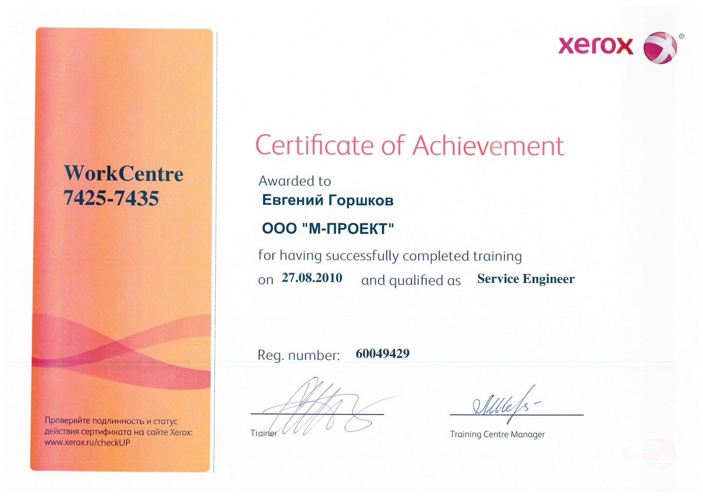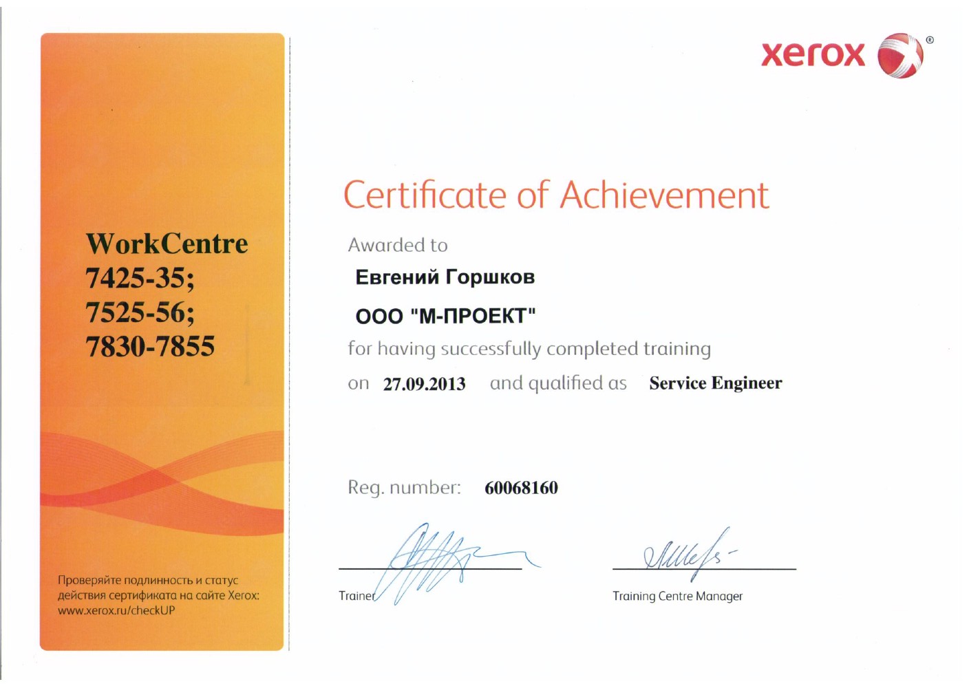 Данные сертификаты подтверждают, что компания «М-Проект» является Авторизованным сервисным и бизнес-партнером компании Xerox