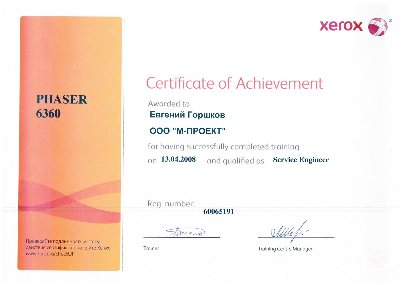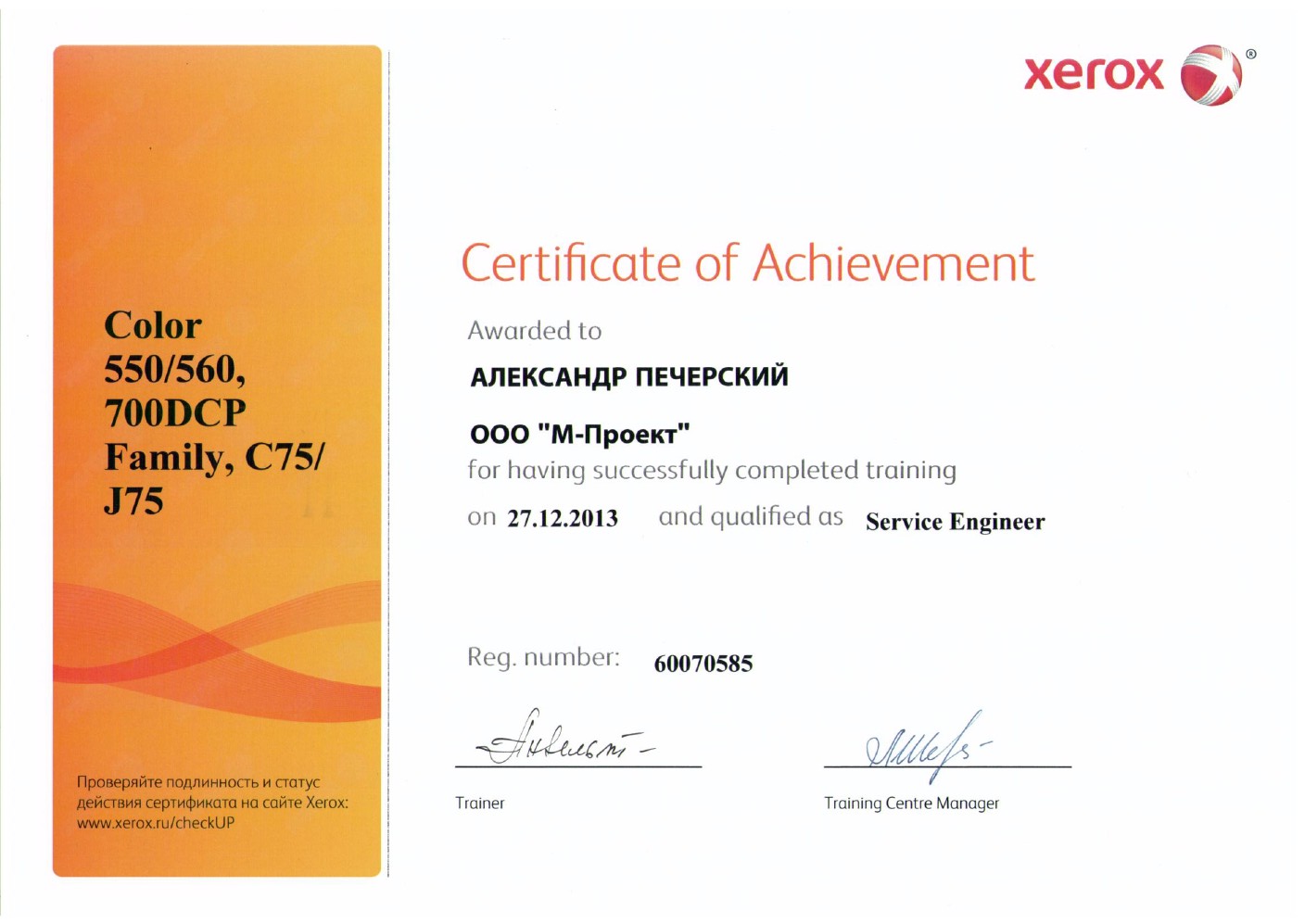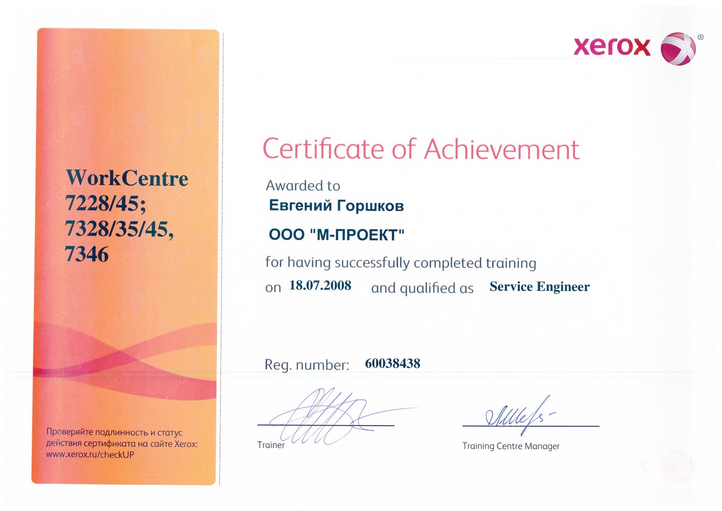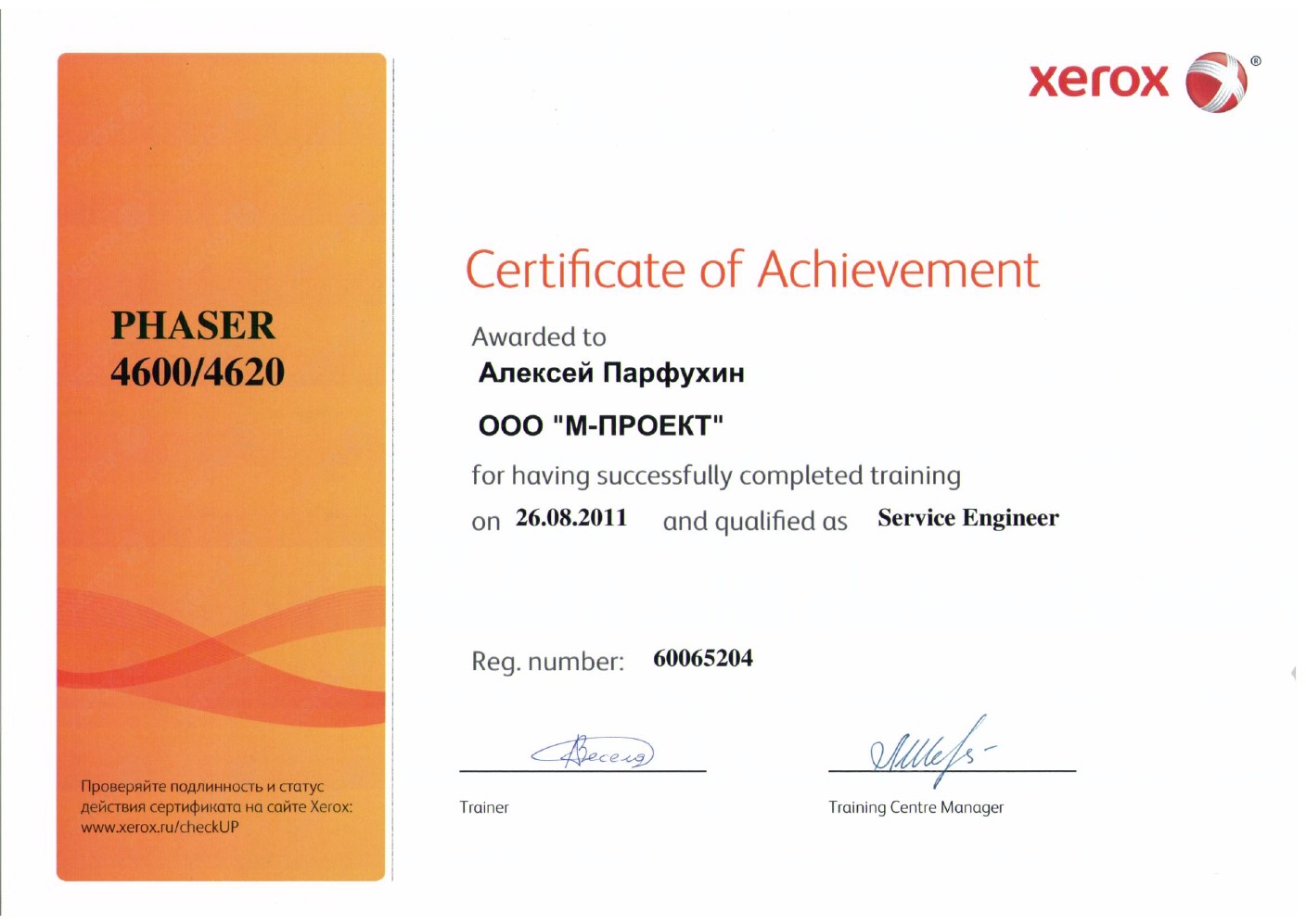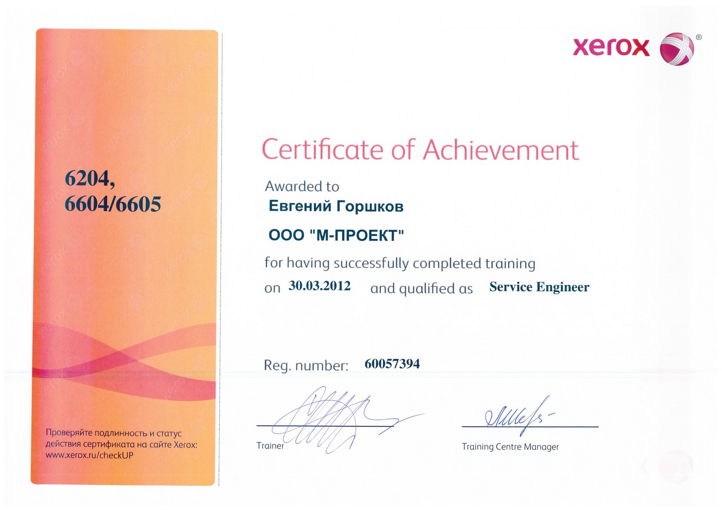Данные сертификаты подтверждают, что компания «М-Проект» является Авторизованным сервисным и бизнес-партнером компании Xerox